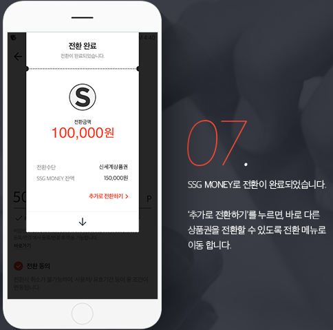 SSG MONEY로 전환이 완료되었습니다. 추가로 전환하기를 누르시면 바로 다른 상품권을 전환할 수 있습니다.