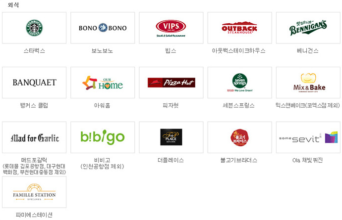 외식으로는 스타벅스, 브노브노, 빕스, 아웃백스테이크 하우스, 베니건스, 뱅커스클럽, 아워홈, 피자헛, 세븐스프링스, 믹스앤베이크, 매드포갈릭, 비비고, 더플레이스, 불고기브라더스, 채빛퀴진, 파미에스테이션 등이 있습니다.