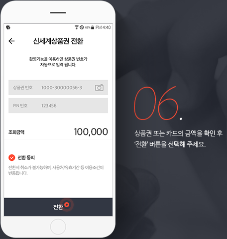 상품권 또는 카드의 금액을 확인 후 전환 버튼을 눌러주세요.