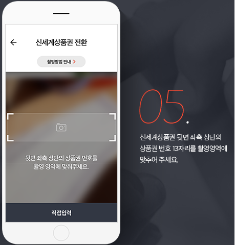 신세계상품권 뒷면 좌측 상단의 상품권 핀번호 13자리를 스캔해주세요.