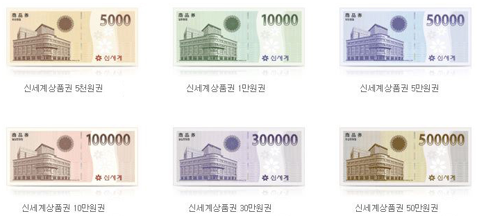 종이 상품권의 종류로는 5천원권, 만원권 5만원권, 10만원권, 30만원권, 50만원권이 있습니다.