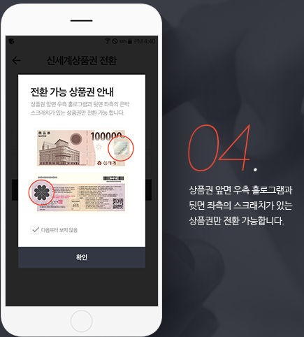 상품권 앞면 우측의 홀로그램 및 뒷면 좌측의 스크래치가 있는 상품권만 가능하답니다.