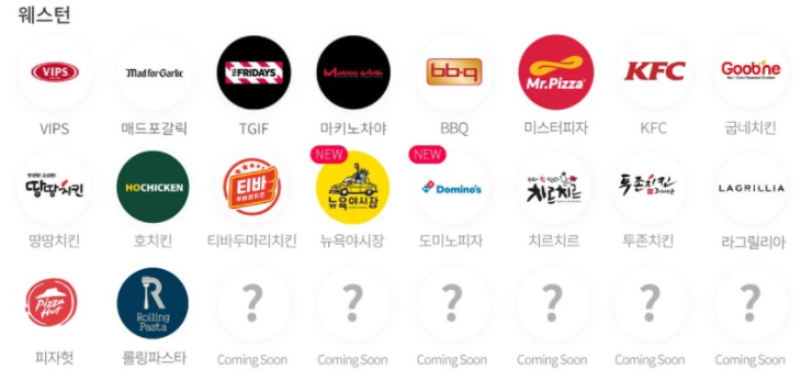 웨스턴으로는 빕스, 매드포갈릭, TGIF, 마키노차야, BBQ, 미스터피자, KFC, 굽네치킨, 땅땅치킨, 호치킨, 티바두마리치킨, 뉴욕야시장, 도미노피자, 치르치르, 투존치킨, 라그릴리아, 피자헛, 롤링파스타 등이 있습니다.