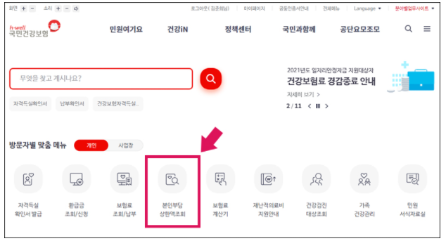 먼저 홈페이지에 들어가신 후 아래와 같이 메인 화면 중간에 화살표 한 '본인부담 상한액 조회'로 들어갑니다.