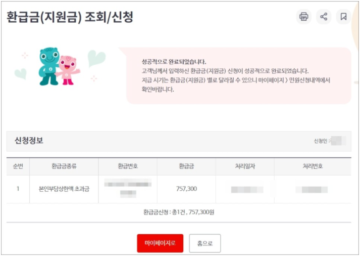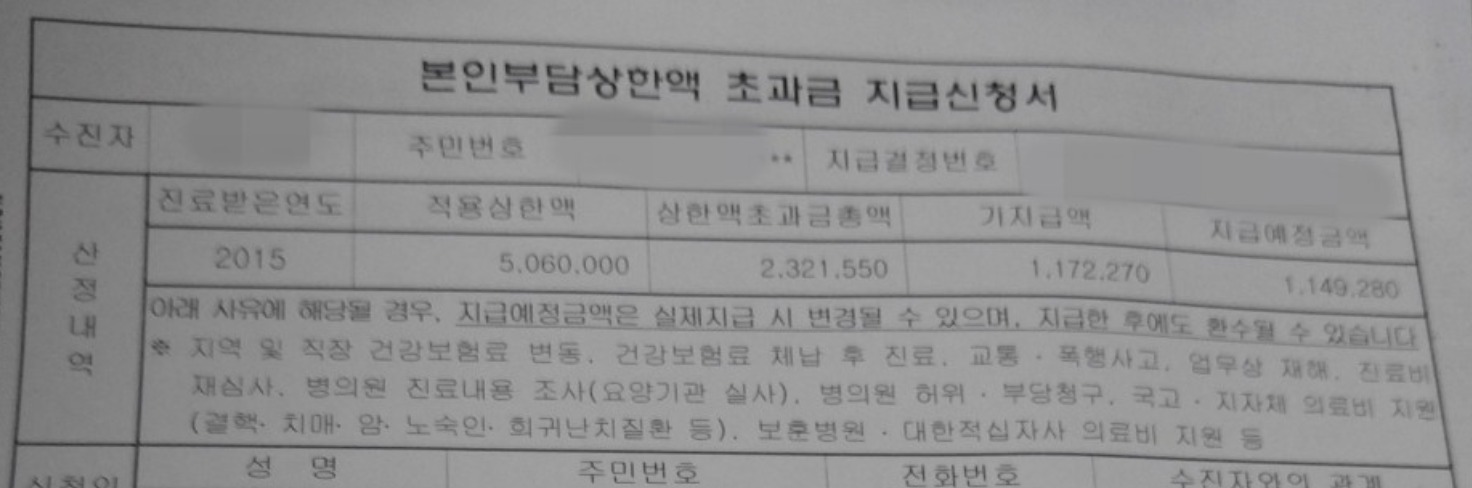 본인부담상한액 초과금을 환급받기 위해서는 진료받은 사람이 반드시 본인 예금계좌로 지급신청을 하셔야 합니다.