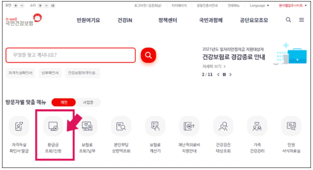 국민건강보험 홈페이지에 들어가서 환급금 조회/신청을 할 수 있습니다.